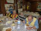 A mezzogiorno il parcheggio aerei è abbastanza affollato e sul cielo campo è sempre presente qualche cosa che vola. E nel primo pomeriggio finalmente prende vita il Farfallo; arrivato a bordo di un camion viene montato davanti al meeting point. Mi viene chiesto di provare una tuta con la scritta "Il guardiano del farfallo", e visto che mi va a pennello ... vengo ufficialmente investito dell'incarico. Cena "contadina" al ristorante del meeting e serata con musica anni 70; l'incasso sarà devoluto in beneficienza. Il ristorante è pieno e noi, assieme a Lucio(ne), troviamo a fatica tre posti vicini. Durante la cena ci viene comunicato che l'incasso, detratte le spese, ha fruttato 1800€ e questa è la cifra che verrà versata. Anche questo è MdP e VDS !