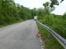 Alle 10,15 sono in salita, poco prima di S.Andrea di Sorbello, quando sento un colpetto strano e mi si accendono spie sul cruscotto mentre il motore cala repentinamente. Stacco subito la chiave e mi butto su una piccola rientranza a destra. Apro il cofano e ... non esiste più la cinghia dei servizi. Chiamo l'assicurazione che mi mandi un carro attrezzi, e dopo poco più di un'ora arriva la telefonata dell'autista che parte ora da Perugia ... fra un'oretta sarà qui.