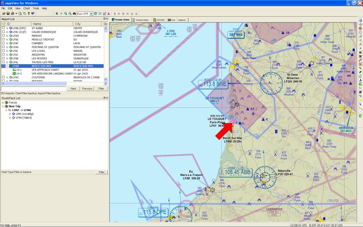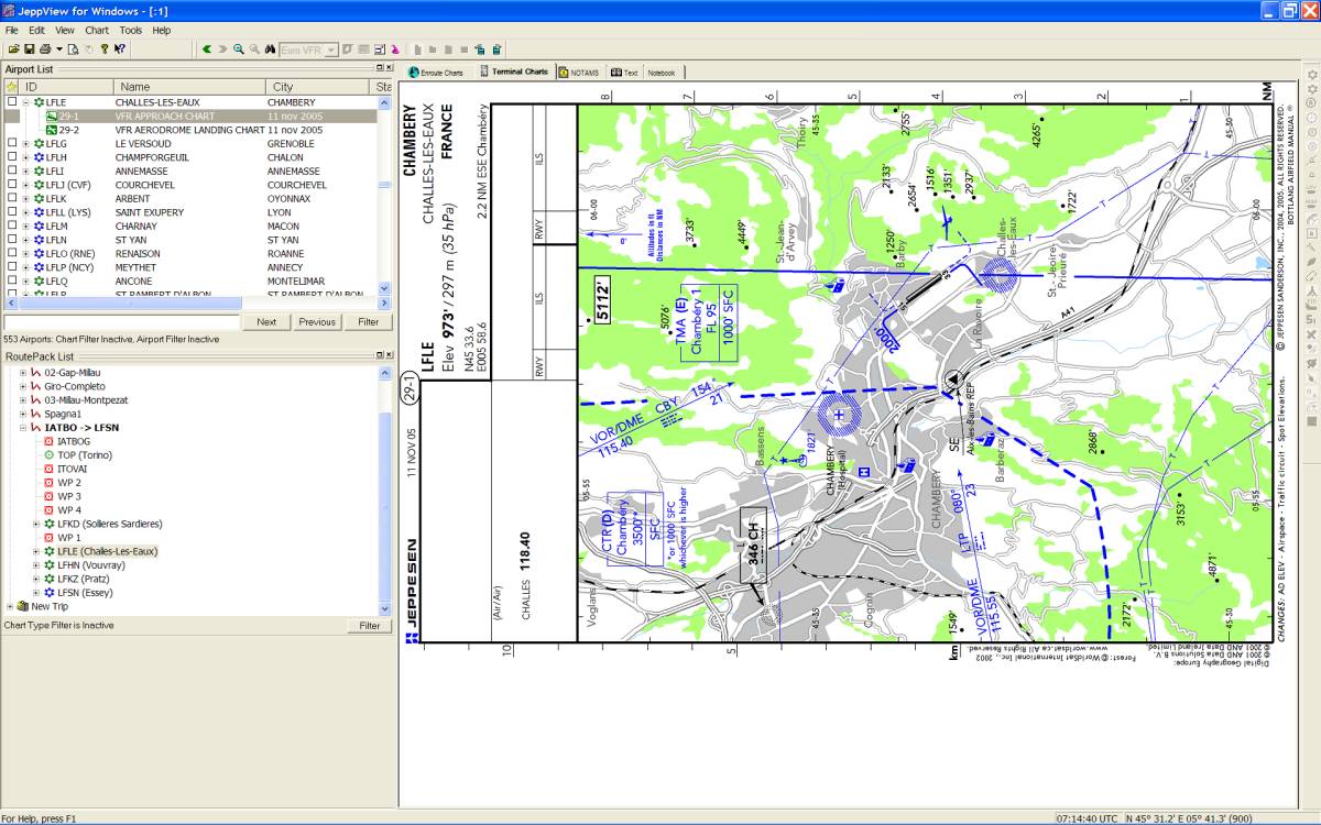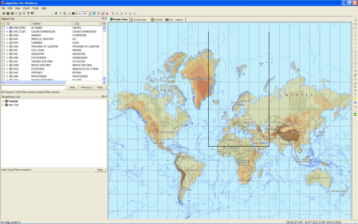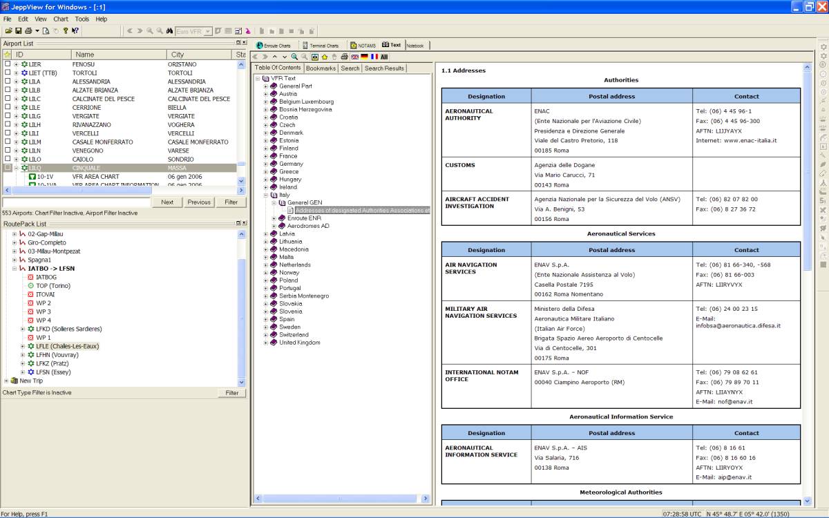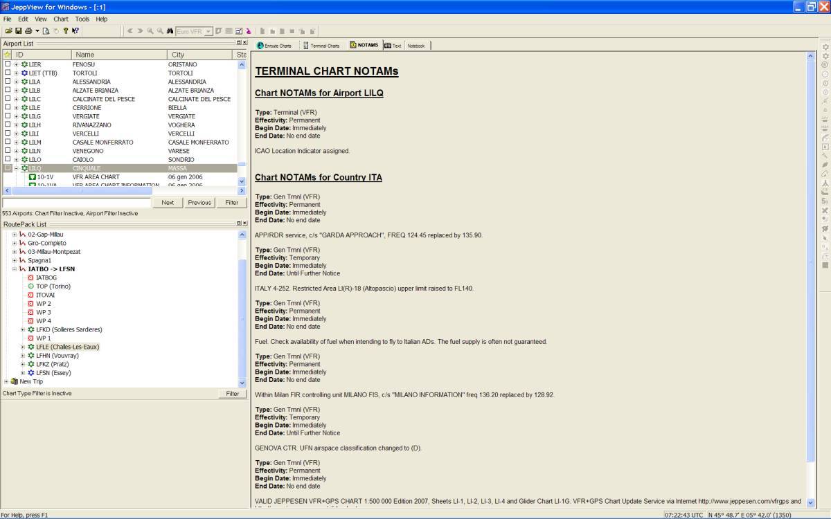 La videata è, a sua volta, divisa in 5 schede: Enroute charts (si apre di default), Terminal charts, Notams, Text, Notebook.