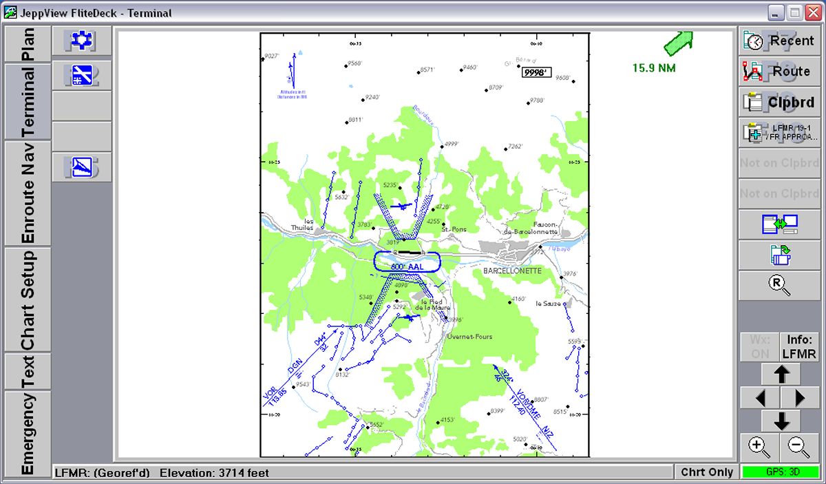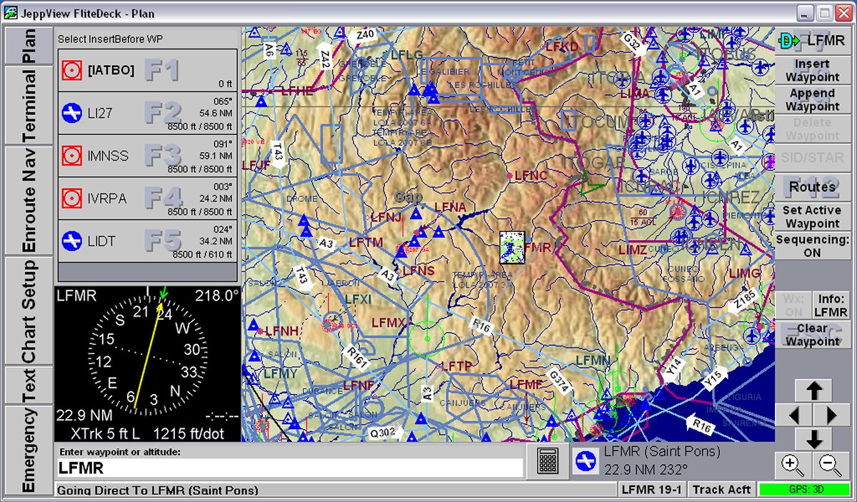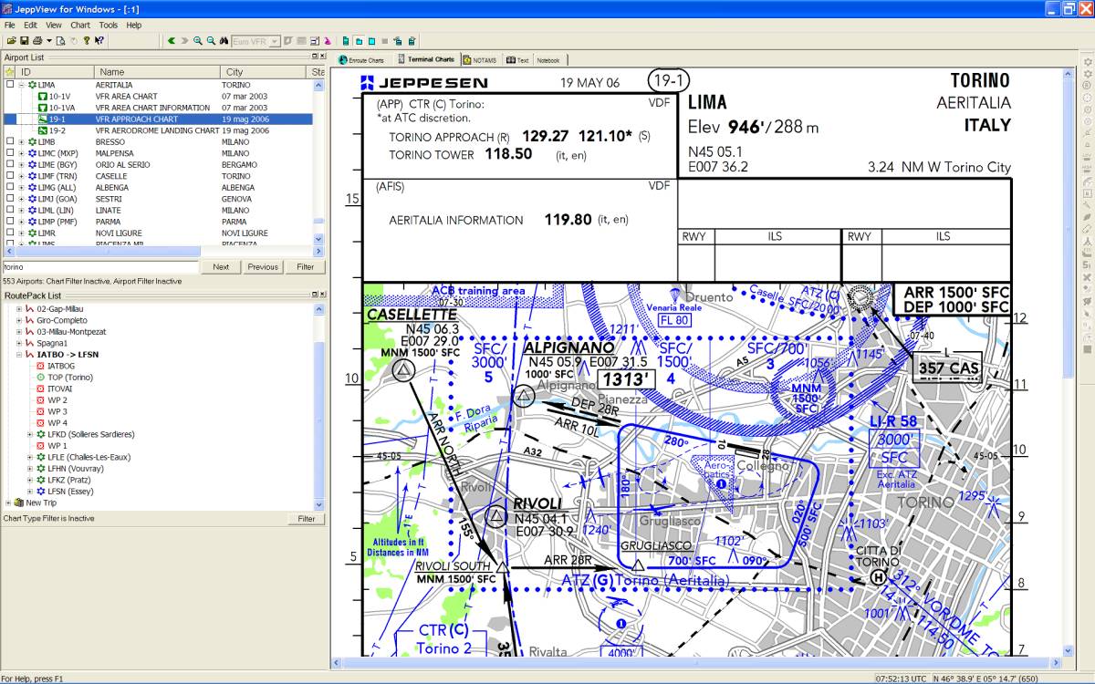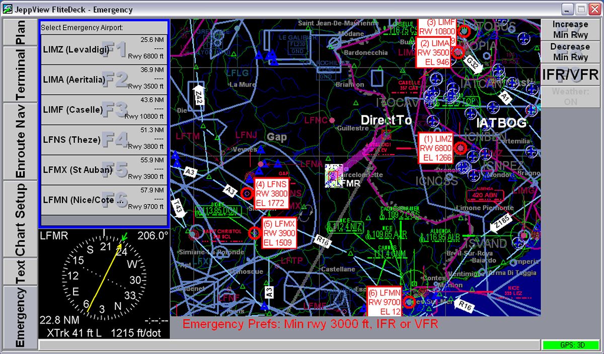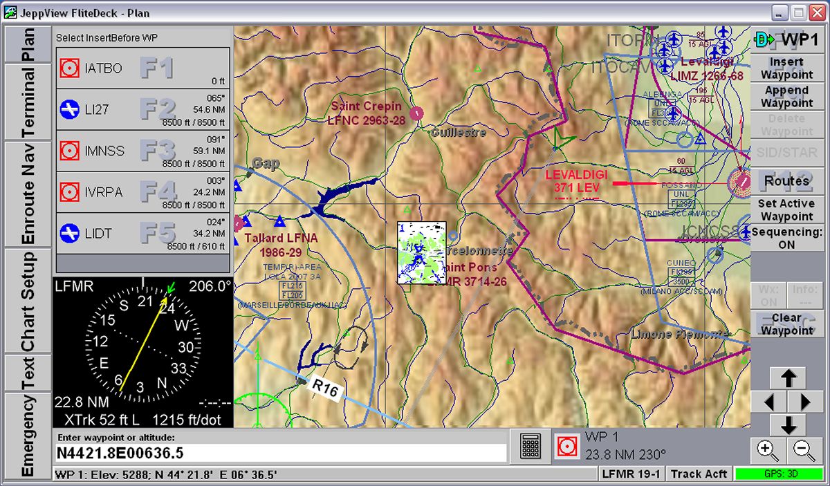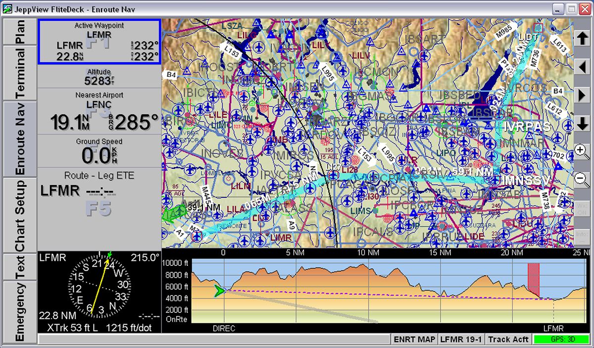 Nella scheda Terminal Charts è possibile effettuare alcune operazioni sulla carta visualizzata: ruotare l'immagine e ingrandirla a piacere oltre a visualizzare solo la parte superiore contenente i dati dell'aeroporto, oppure quella inferiore. La scheda Notams contiene i Notam relativi all'aeroporto selezionato nella Airport List oltre ai Notam relativi all'area in cui l'aeroporto scelto si trova. Ovviamente questa pagina viene aggiornata via Internet insieme agli aggiornamenti del database. La scheda Text contiene invece una serie di informazioni generali sul volo VFR nei vari paesi europei: riferimenti agli enti aeronautici, divisione degli spazi aerei e frequenze dei servizi informativi, servizi meteorologici e molto altro. La scheda ha moltissime altre opzioni e si rivela una vera fonte di informazioni. Veramente molto interessante. Nella scheda Notebook è possibile scrivere note come su un normale taccuino: numeri telefonici, promemoria o qualsiasi altra cosa possa servire al pilota VFR. E' possibile muoversi sulla cartografia, come sulle altre immagini, spostando il mouse ai margini della videata fino a quando appare un triangolo che indica la direzione dell spostamento. E' un metodo, questo, assai poco istintivo per chi utlizza normalmente il Pc, abituato a spostare la carta "pizzicandola" con il mouse per poi spostarla nella direzione desiderata. Una parte molti interessante, che riguarda direttamente l'utilizzo di questo programma, è relativo alla stampe; è possibile infatti, stampare con moltissime opzioni e il pilota può crearsi un vero e proprio Bottlang cartaceo utilizzando fogli in formato Jeppesen, da porre nei raccoglitori standard, oppure in propri raccoglitori. JeppView, se installato su un Pc portatile, funziona anche con un ricevitore GPS, diventando una sorta di navigatore satellitare. Chi ha già installato sul proprio Pc FliteStar noterà alcuni cambiamenti anche in questo programma, dove nella parte sinistra della videata oltre alla lista delle rotte memorizzate, comparirà anche l'elenco degli aeroporti. FliteDeckLo stesso discorso vale per il programma FliteDeck, fornito come dicevamo, insieme a JeppView, il quale trasforma il portatile in un vero GPS a colori con moltissime funzioni davvero belle e utili anche se, anche per questo, vale il discorso precedentemente fatto per quanto riguarda l'utilizzo in volo. FliteDeck può essere collegato con un ricevitore GPS via cavo o via Buetooth. Su JeppView e FliteDeck è possibile caricare waypoints personalizzati anche se la procedura per trasformare il formato dei waypoints in formato Jeppesen-compatibile non è proprio semplicissima e viene fornita soltanto a richiesta tramite posta elettronica. Periodicamente JeppView richiede un aggiornamento e, in quel momento, le carte non possono essere visualizzate fino ad aggiornamento completato (salvo cambiare temporaneamente la data sul pc... ma rimane il fatto che il database non è aggiornato). Tale aggiornamento avviene tramite CD, inviato via posta, oppure tramite collegamento ad Internet. Durante il test l'aggiornamento trimestrale ha richiesto comunque molto tempo, vuoi per il carico di lavoro del server della Jeppesen (conviene fare gli aggiornamenti in orari insoliti) vuoi per la mole dei dati che vengono scaricati ed installati. Un aggiornamento richiede tranquillamente un paio di ore. Le immagini a lato potranno aiutare a comprendere meglio le possibilità di questo software. Cosa mi piace di JeppView