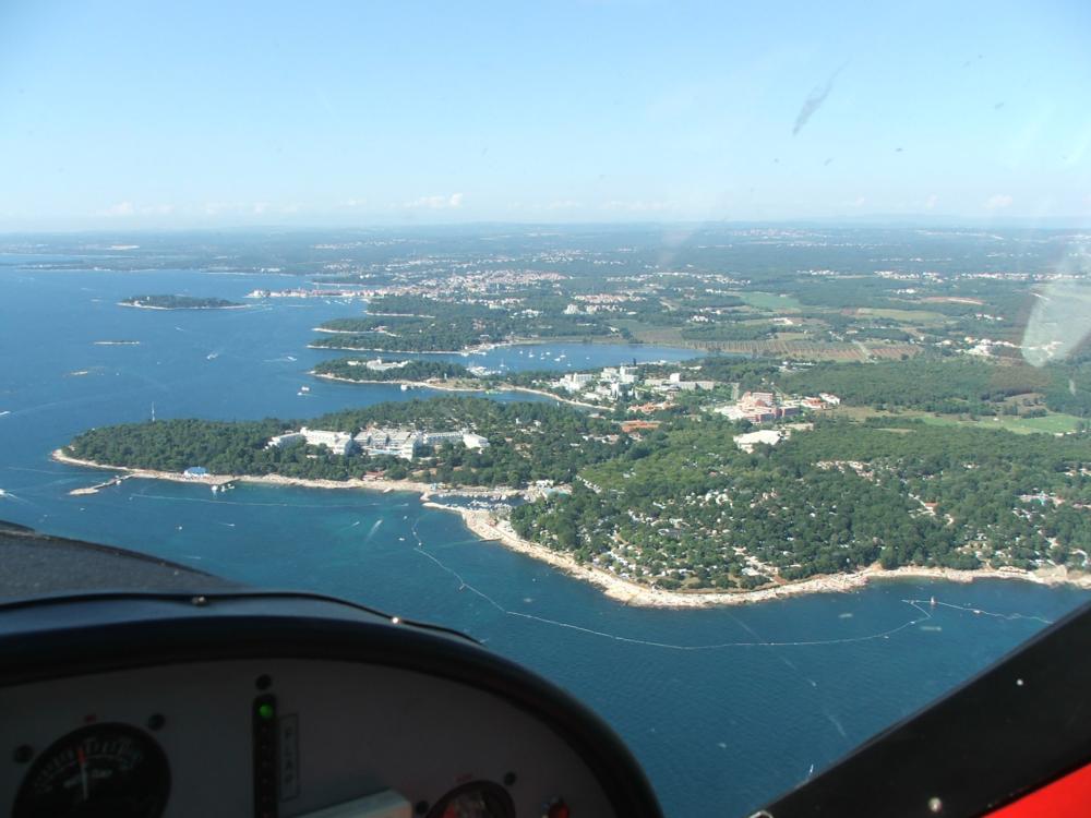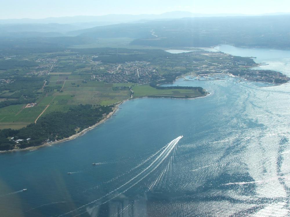 Piatta assoluta, non si muove una foglia ... (difficile trovare foglie in mezzo al mare!); come ci aveva predetto Sandro, impossibile perdere la rotta, basta seguire le bianche scie spumeggianti lasciate dalle colonne di motoscafi che, pure loro, fanno rotta verso la Croazia. Dopo circa 15' puntiamo vesro la terra istriana ed eccoci in prossimità di Novigrad; seguiamo la costa godendo di un paesaggio incantevole sino a Vrsar. Sentiamo Lucio atterrare per la 18 ma alla nostra chiamata ci viene assegnata la 36 ... si va dal fiordo ... ancora più pittoresco! Sistemati i "puledri" ci rechiamo da Raiko (il Boss!) a registrare il nostro arrivo e paghiamo la tassa(?) d'atterraggio (20€); mostriamo la carta d'identità ad una assonnata "doganiera" ed usciamo dall'aeroporto per farci portare in centro dal (pseudo) taxi chiamato da Raiko.