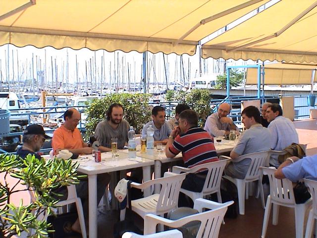 IFC non sarebbe IFC se non organizasse subito dopo un breefing postvisita e, scartato il centro città per ovvi motivi di parcheggio, optiamo all'unanimità per la vicina sede del Club Nautico, dove, per poter impegnare la tavola rotonda del dibattito, siamo obbligati ad ordinare piatti vari di pesce fresco che poi (di conseguenza) siamo costretti a svuotare per evitare il fastidioso odore di pesce!