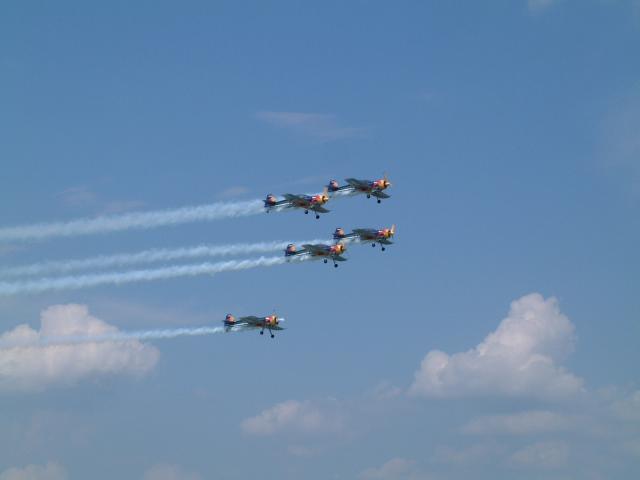 Ed ecco sopra di noi 5 vere macchine volanti; sono i Sukoi della pattuglia civile (con piloti ex PAN!) dei "Red Bull" che ci fanno girare la testa con le loro stupende evoluzioni; GB Molinaro, Angelo Boscolo, Beppe Liva, Stefano Giovannelli, Stefano Rosa: scusate se è poco! C'è bisogno di commenti?