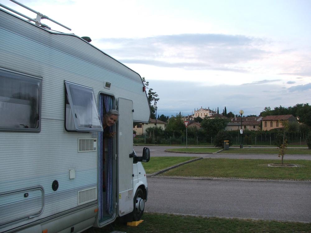 Pensavo di essere quasi solo ed invece trovo già posizionati una quindicina di camper; l'ampio e ben curato parcheggio è proprio frontale alla villa e dal punto in cui ho "livellato" il camper se ne scorge la facciata. Mi dicono che l'ingresso alla base dista circa 2 km; sono proprio convinto che non mi sposterò tanto facilmente.