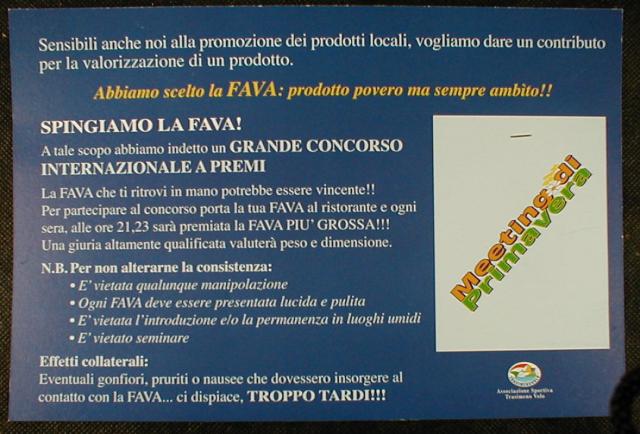 La serata continua con il grande concorso "valorizziamo la fava". Ogni partecipante deve presentare la propria (ricevuta all'accoglienza) nelle mani di una giuria composta da otto Signore che, valutandone peso e dimensioni, esprimeranno il loro parere. La serata prosegue con i famosi "salvataggi" SAR del Golden-ball, per concludersi con un paio d'ore di OTTIMO "Rock&roll" eseguito magistralmente dal complesso di Fabio "Gorilla" Crivelli.