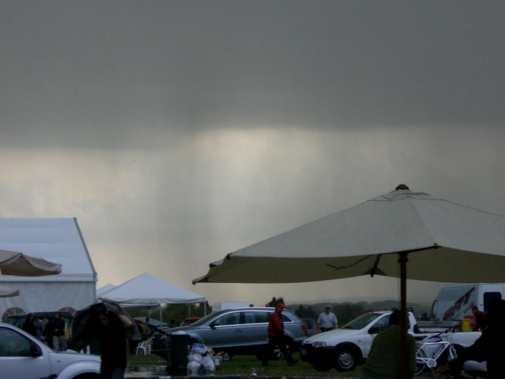 Nel primo pomeriggio vento e nuvole in veloce avvicinamento da nord presagiscono un imminente temporale e difatti tra le 16 e le 17-17,30 un nubifragio si sfoga violentemente sul campo con tuoni fulmini e qualche "assaggio" di grandine; cerchiamo tutti un minimo di riparo e tutto ciò che lo può procurare viene irrimediabilmente "sovrappopolato".