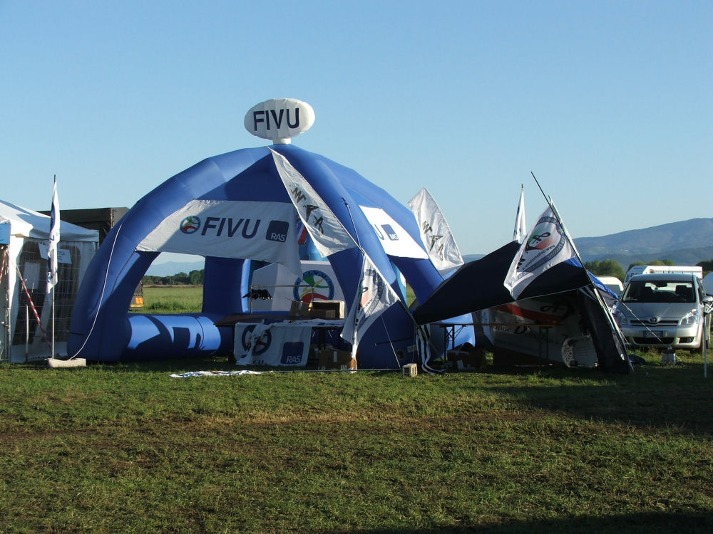 Verso le 10,30-11 il vento è talmente rinforzato da costringere lo sbaraccamento di diversi stands; anche noi mettiamo a terra il gonfiabile FIVU ed io aggiungo tiranti alla mia tenda.