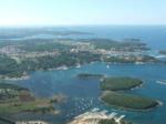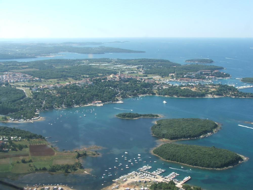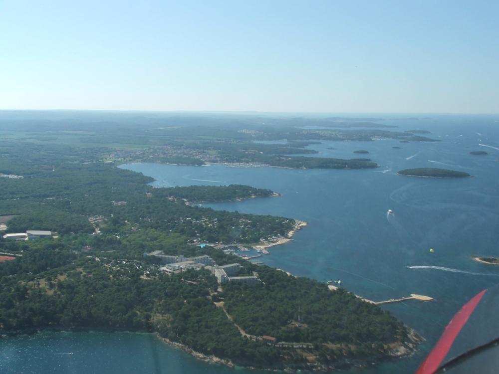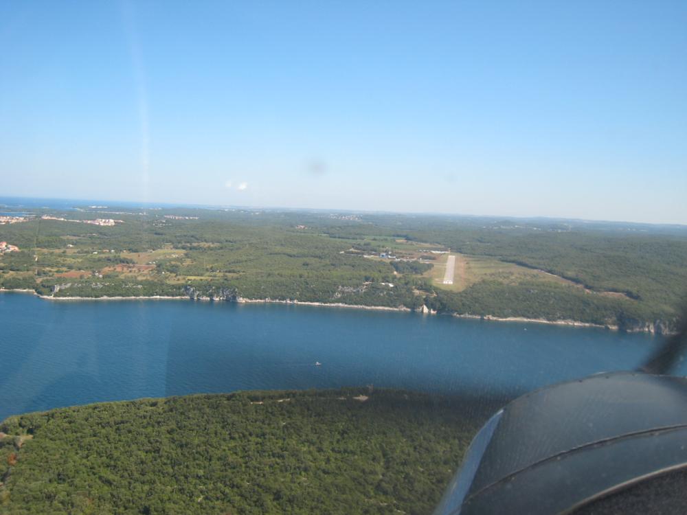 Piatta assoluta, non si muove una foglia ... (difficile trovare foglie in mezzo al mare!); come ci aveva predetto Sandro, impossibile perdere la rotta, basta seguire le bianche scie spumeggianti lasciate dalle colonne di motoscafi che, pure loro, fanno rotta verso la Croazia. Dopo circa 15' puntiamo vesro la terra istriana ed eccoci in prossimità di Novigrad; seguiamo la costa godendo di un paesaggio incantevole sino a Vrsar. Sentiamo Lucio atterrare per la 18 ma alla nostra chiamata ci viene assegnata la 36 ... si va dal fiordo ... ancora più pittoresco! Sistemati i "puledri" ci rechiamo da Raiko (il Boss!) a registrare il nostro arrivo e paghiamo la tassa(?) d'atterraggio (20€); mostriamo la carta d'identità ad una assonnata "doganiera" ed usciamo dall'aeroporto per farci portare in centro dal (pseudo) taxi chiamato da Raiko.