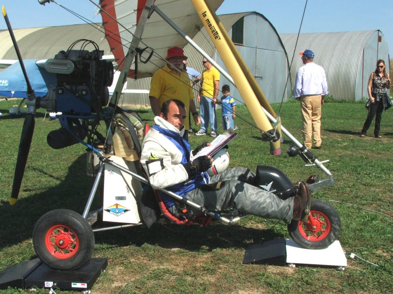 E arriva il momento della verità. Non ho la minima idea di quanto sia vicino (o lontano) ai fatidici 450 kg; carico 22-23 litri di benzina e saliamo a bordo. Dopo un attimo la voce di Giulio mi spara un 456 Kg. Breve attimo di riflessione e decido che ... sì, si può fare, voglio dimostrare che anche il mio fido P92 può partecipare al Campionato Italiano!