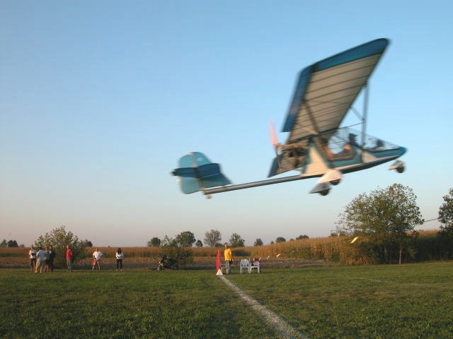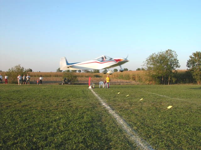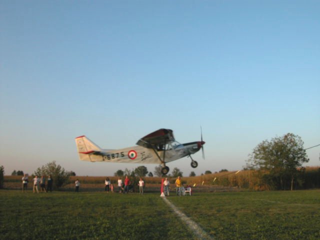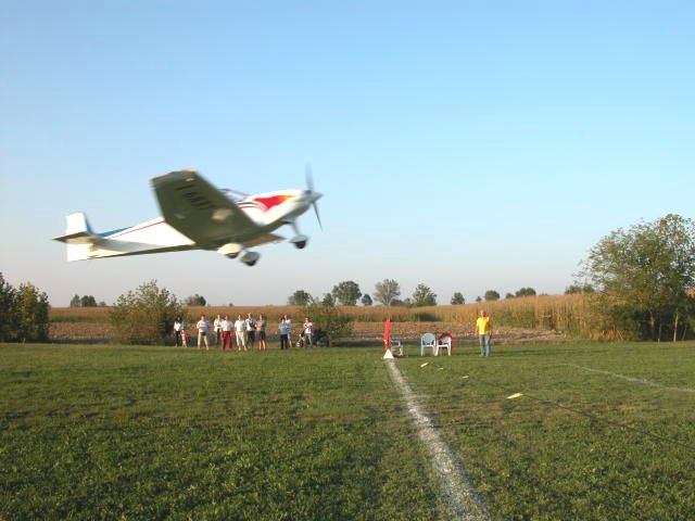 Faccio un pò di quota per avere una visuale più ampia ed ecco che scorgo lo striscione bianco davanti a me. Sono in anticipo e quindi eseguo un 360° prima di immettermi in "dirittura finale" ; la moglie mi scandisce i secondi mancanti ... troppi ... flap e minima di sostentamento ... stop !