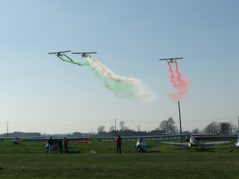 Nel pomeriggio, a mò di ciliegina di questa magnifica giornata d'inizio stagione volatoria, tre colorati Firefox eseguono alcuni passaggi sulla pista e concludono con una bella e spettacolare fumata tricolore e poi ... tutti in ordinata fila per i decolli in sequenza.